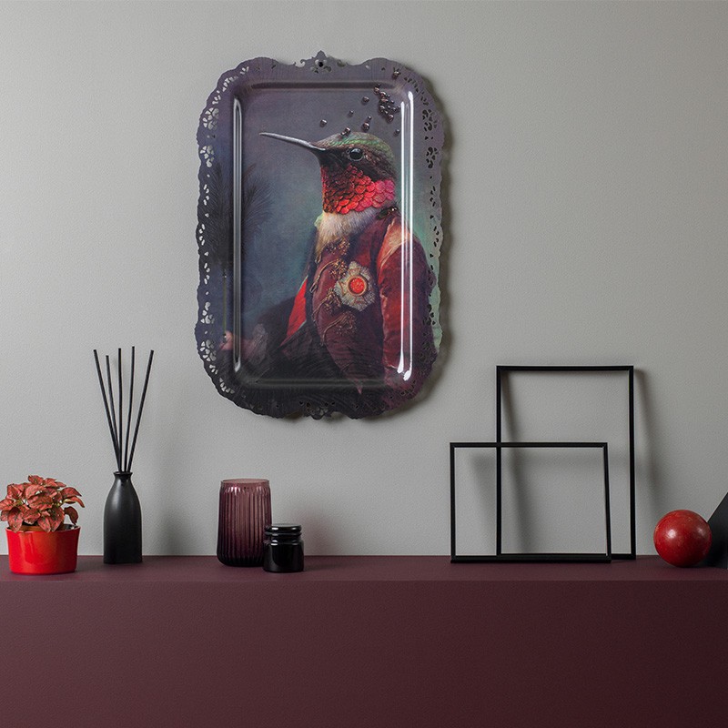 Le plateau de service AMBROISE dissimule avec grâce et habilité un tempérament fort. Il sert au service, et ensuite s'expose librement sur le mur comme une oeuvre picturale, une peinture mythologique, pleines d'histoires.
