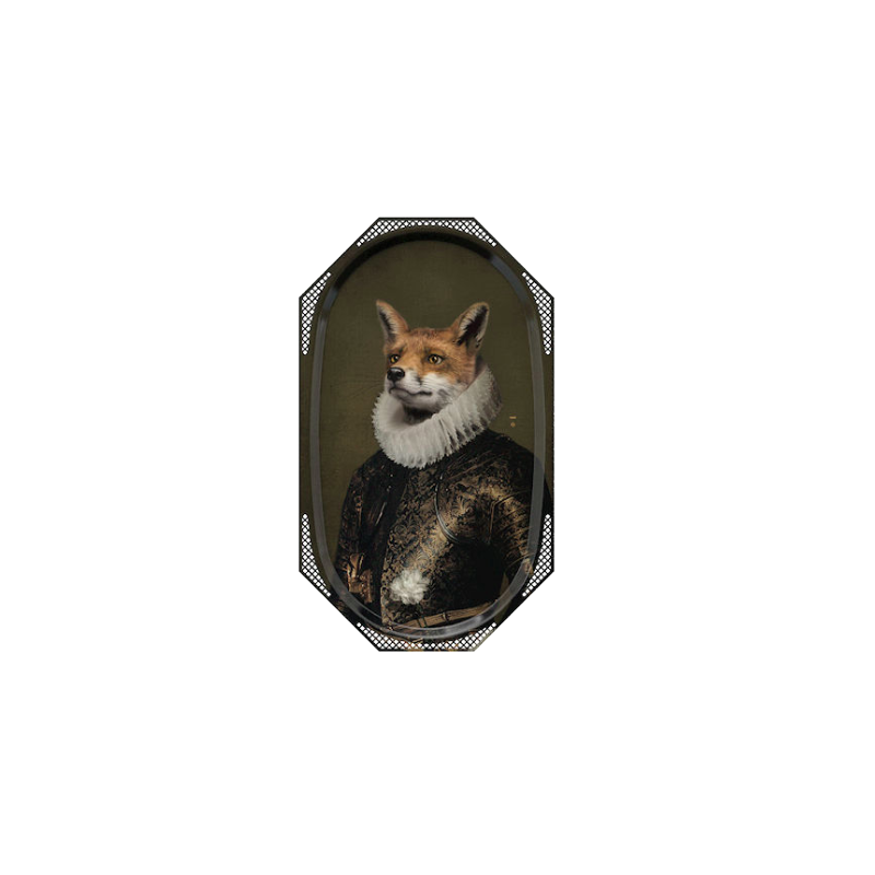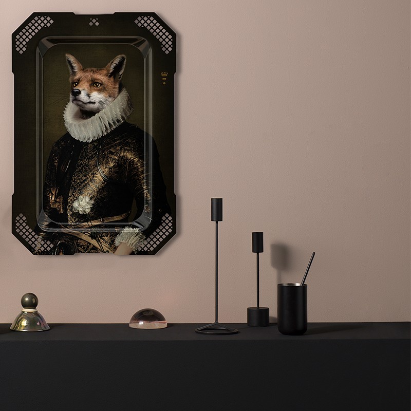 Le plateau de service RENARD dissimule avec grâce et habilité un tempérament fort. Il sert au service, et ensuite s'expose librement sur le mur comme une oeuvre picturale, une peinture mythologique, pleines d'histoires.