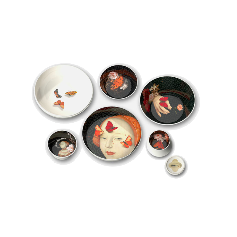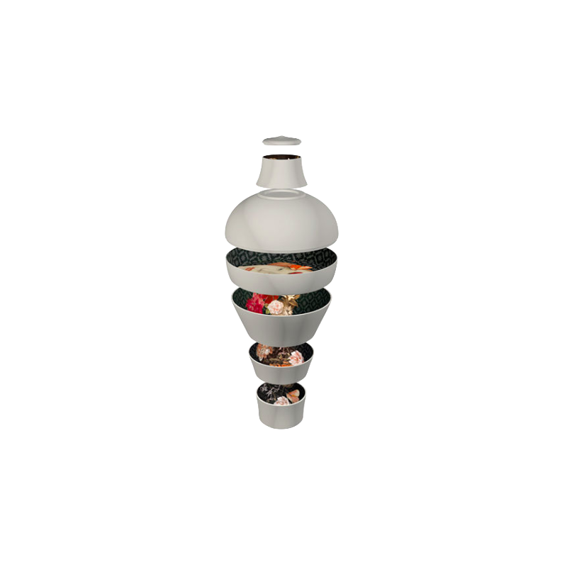 Les "faux-semblants" rendent hommage au célèbre vase asiatique "éponyme". Une fois assemblé, le subtile vaisselier composé d'assiettes, de saladiers, et de set de présentation. Lignes pures et culture lointaine, les services de table, trouveront leur place dans votre intérieur, laissant penser à un objet décoration.