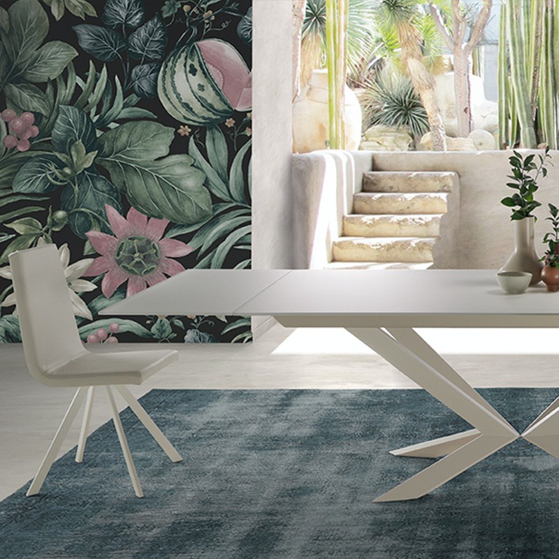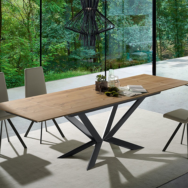 Ce modèle se décline en fixe ou extensible. Plateau bois, verre ou céramique.