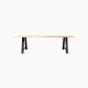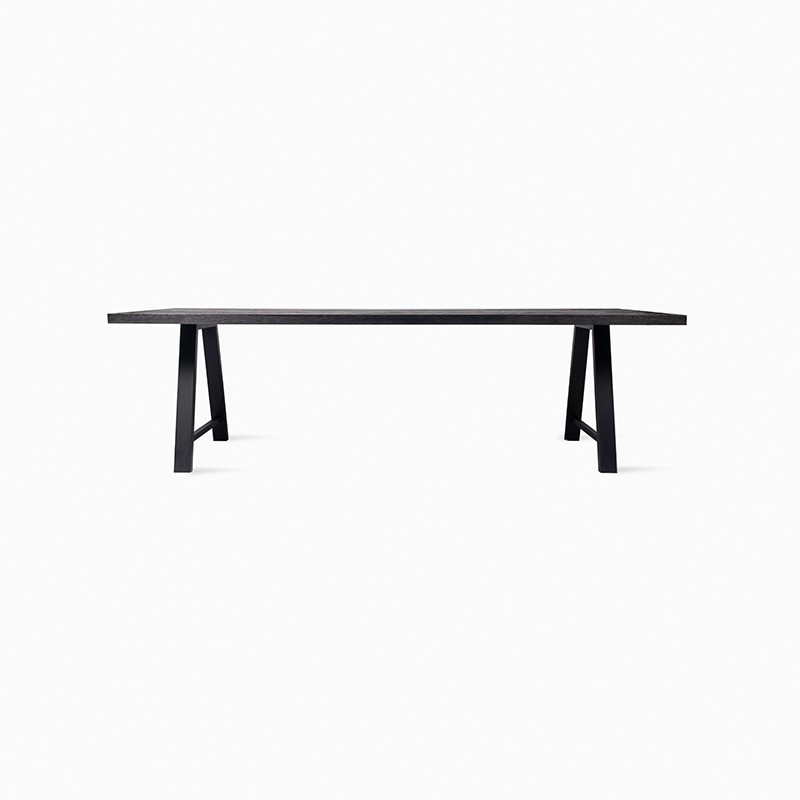 Un modèle de table à diner avec un plateau chêne rectangulaire sans biseau. Un piètement en finition acier thermolaqué. Ce modèle existe en modèle chêne noir, piètement A, X ou carré.
