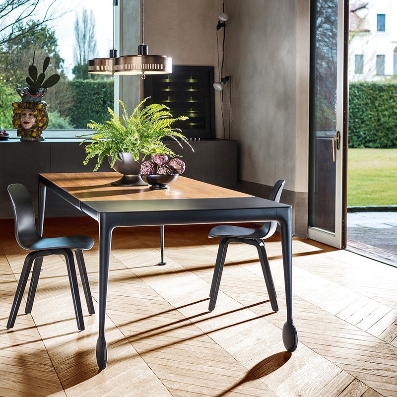 Table Big Will, un modèle très original aux pieds très travaillés (roues pour aider à rallonger la table). Son plateau noyer et sa finition pieds noirs laqués apportent une atmosphère douce. De plus, ses pieds originaux apportent la touche design à votre salon. Enfin, sa rallonge crée une coupure dans la couleur de la table.