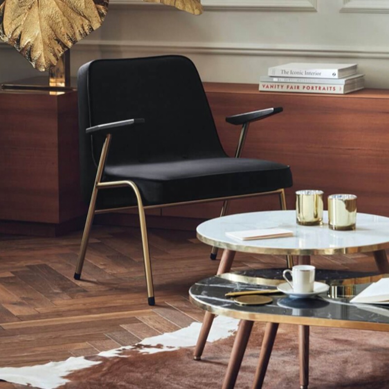 Ce modèle de fauteuil est dans le même esprit que le Fauteuil 366. Cependant avec une finition structure métal. Contrairement à ce qu'on croirai, sa finition métal ne rend pas ce modèle plus "froid". En effet, le bois de l'accoudoir apporte son lot de chaleur pour rendre ce fauteuil accueillant. Ce modèle est présenté en velours et finition chêne (accoudoir).