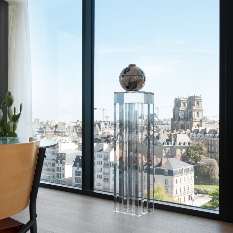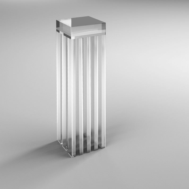 Luxis, équipe de designers établis en Bretagne, associé au savoir-faire de Pluxi, entreprise d'ébénisterie plastique, a revisité un des éléments les plus anciens des arts décoratifs : la stèle.