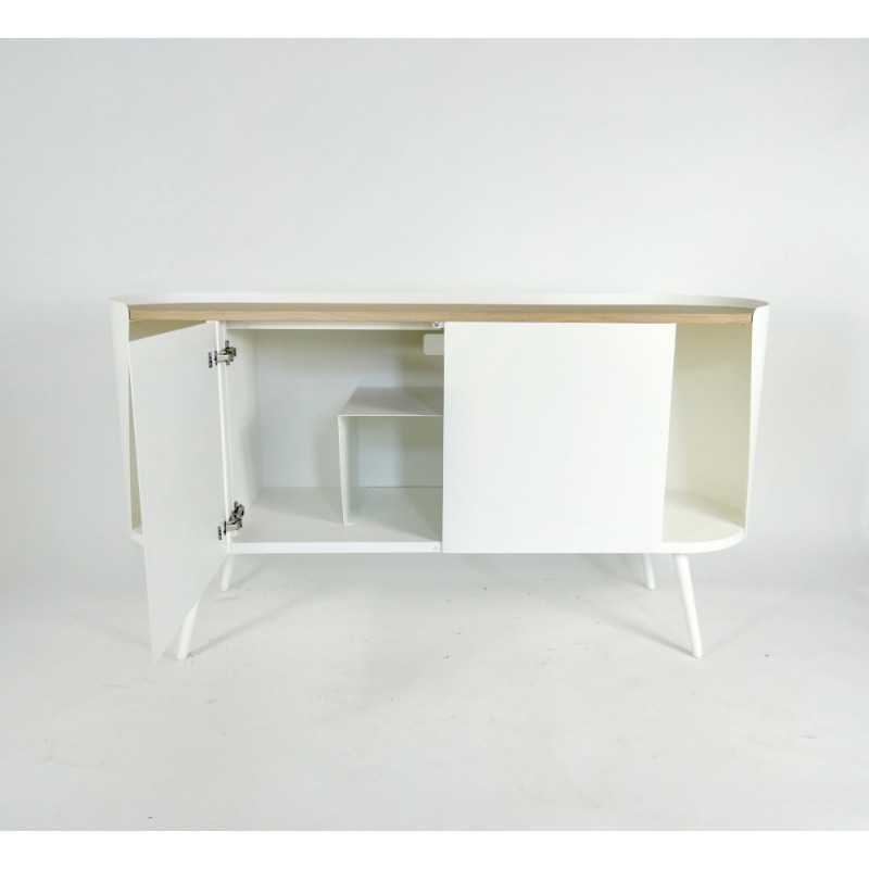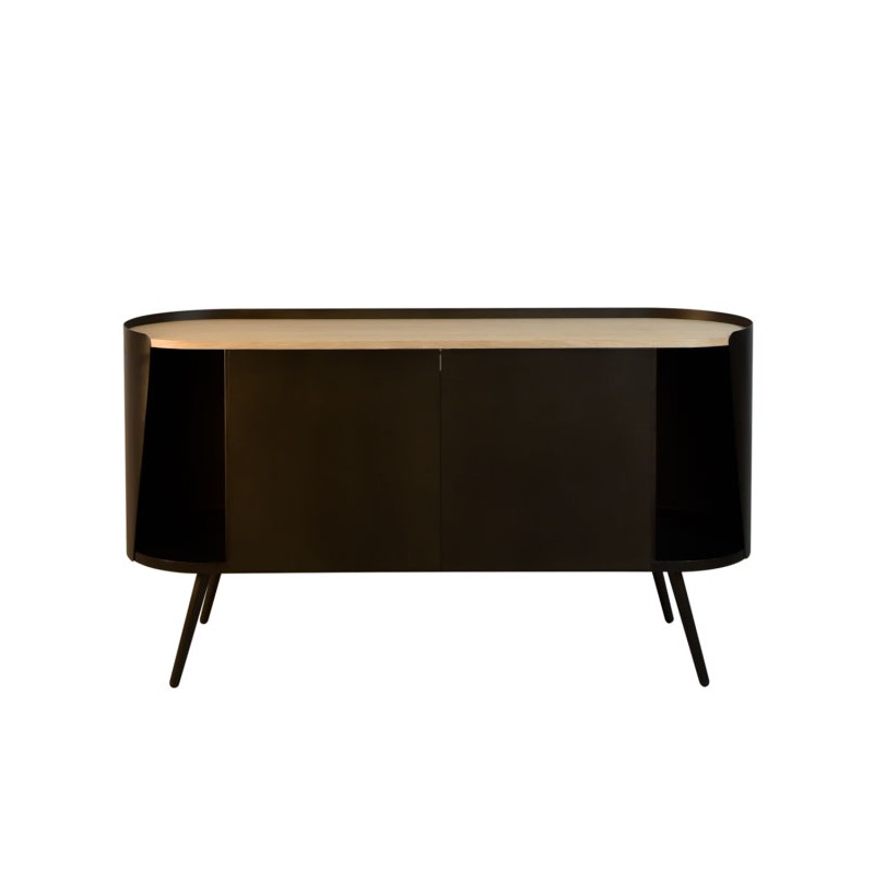 Le Buffet Armand est à la croisée du meuble vintage et de l'ultra contemporain. Ses formes arrondies qui donnent l'envie de le toucher et ses petits pieds en biais rappellent inévitablement les bahuts des années 1950. Mais toute sa modernité et sa personnalité résident dans le fait qu'il est intégralement en acier recouvert de peinture poudre Epoxy thermolaquée. Seul le sommet est en chêne massif et semble presque flotter. Les parties latérales sont ouvertes afin de laisser libre cours à vos envies de décoration.