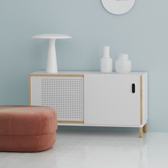 Simon Legald, designer suédois, dit de ses créations "qu'elles sont souvent simples" et que ce sont en règle générale les détails qui lui permettent d'apporter une touche personnelle. Le Buffet Kabino, édité par la maison danoise Normann Copenhagen, en est le parfait exemple.