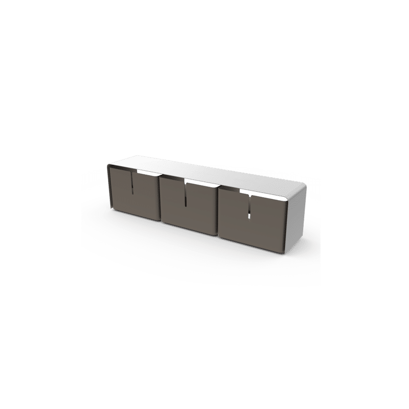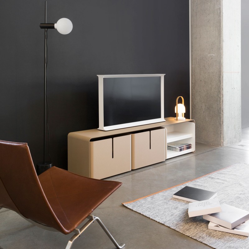 Le meuble TV Barber est signé par le designer Luc Jozancy pour Matière Grise, éditeur français de meubles contemporains en acier et aluminium. Il propose un ingénieux et ludique jeu de cache-cache avec ses trois tiroirs sur roulettes que l'on peut disposer comme on le désire. Aux lignes minimalistes s'ajoute un aspect fonctionnel puisqu'il permet de rendre invisible tout appareil multimédia.