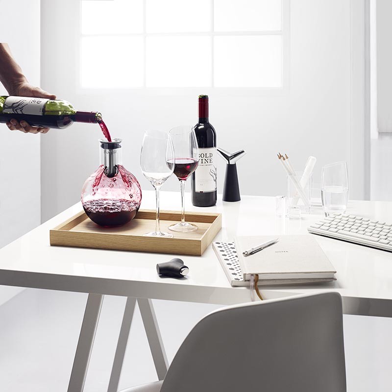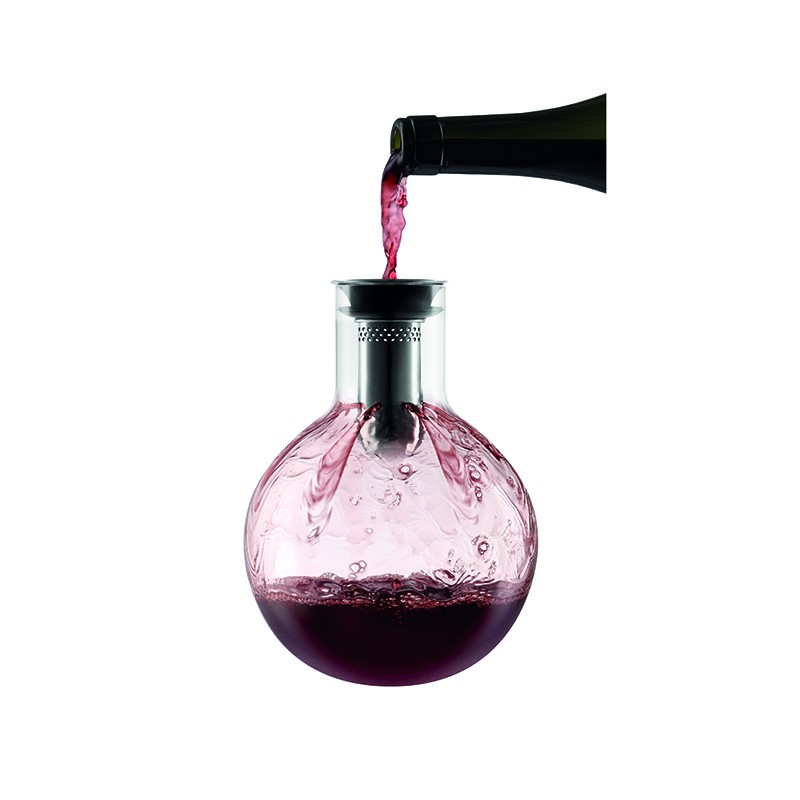 La carafe Eva Solo est conçue pour faire ressortir de meilleur de votre vin. Lorsque le vin est versé dans la carafe, les multiples petits trous qui compose le bouchon laisse passer le vin. La carafe contient jusqu'à une bouteille de vin, et ne goutte pas grâce à son système anti-goutte.