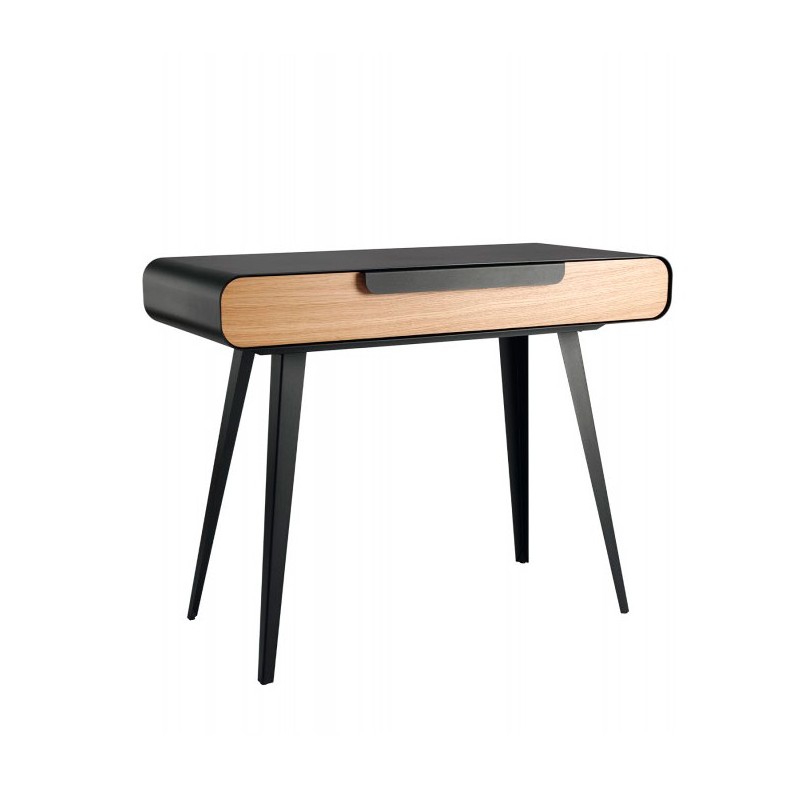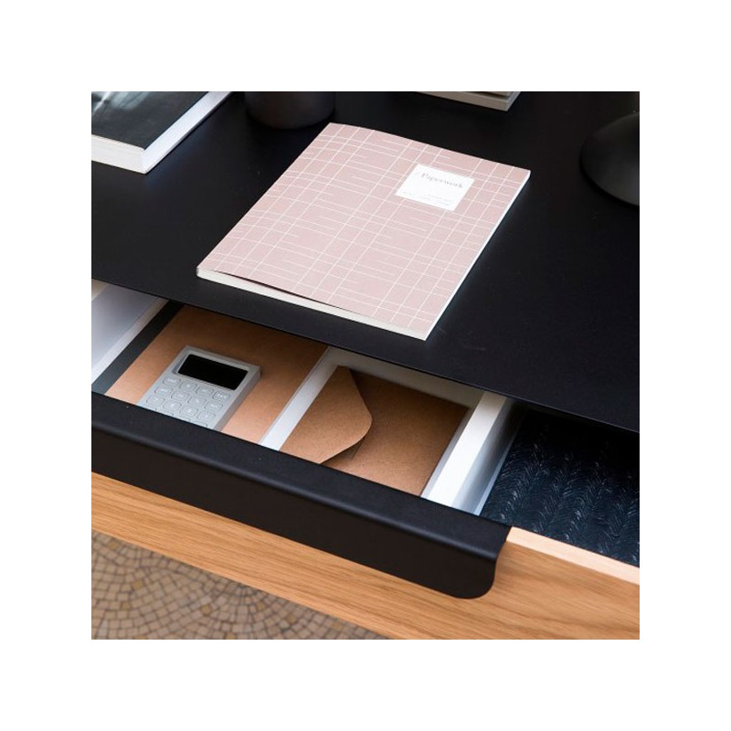 Seule la façade du tiroir en plaqué chêne vient se marier avec le métal.