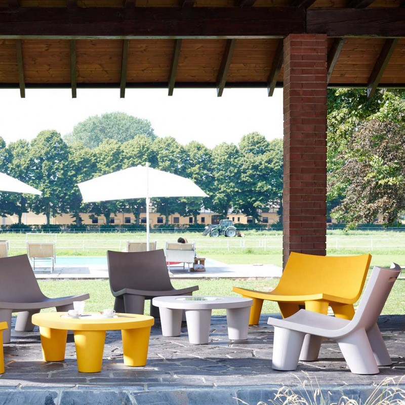 Leur association avec la designer Paola Navone a vu naître un canapé outdoor plein d'humour jusque dans son nom, le Low Lita Love. Une large assise légèrement incurvée pour un confort maximal contraste avec les quatre pieds massifs. Piètement plein d'humour rappelant un certain mobilier pour enfant.