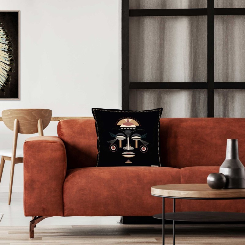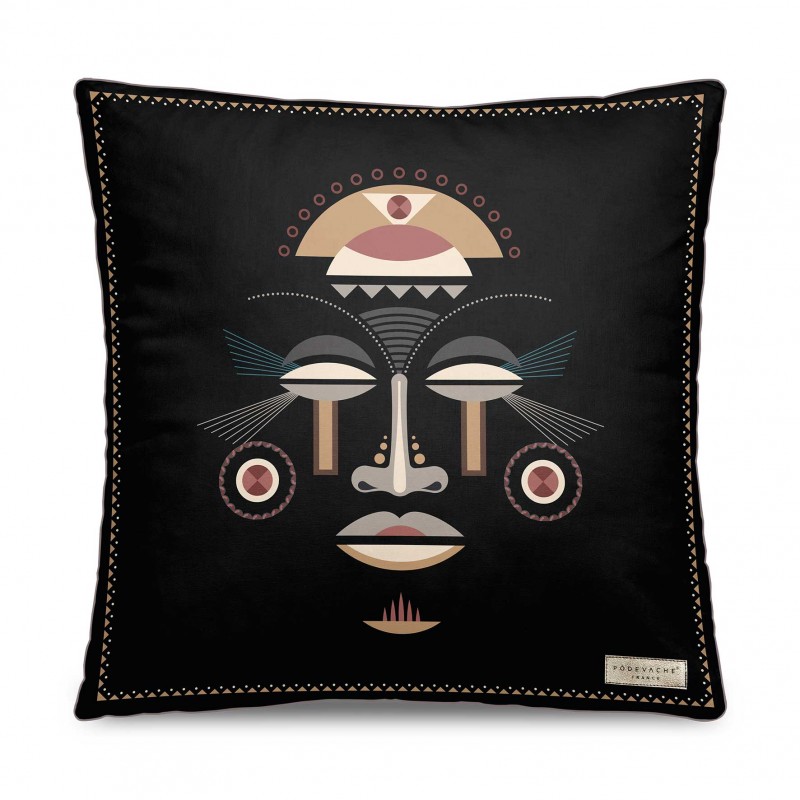 Véritable hymne et hommage à l'Afrique, les coussins aux finitions raffinées au passepoil s'ornent de masques intrigants et gais. Un toucher velours les recouvre tout comme le pouf. Ultra-confortable celui-ci, 100% polyester et rembourré de microbilles de polyester expansé, deviendra rapidement la pièce remarquable de votre décoration.