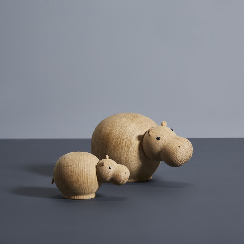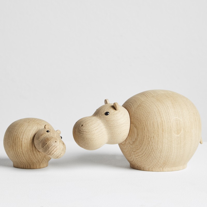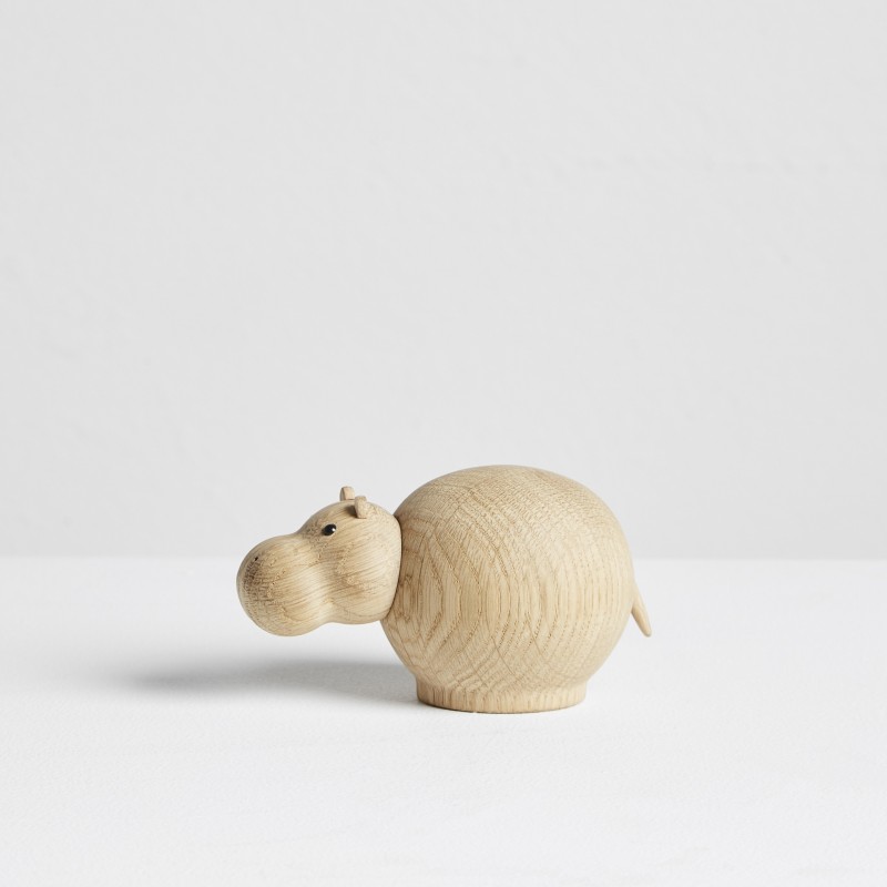 L'Hippopotame Hibo est une petite sculpture minimaliste et terriblement attachante en chêne massif. Comme tous les animaux de cette ligne, l'expression toujours pleine de tendresse de la bête est modifiable grâce à une tête qui peut s'incliner.