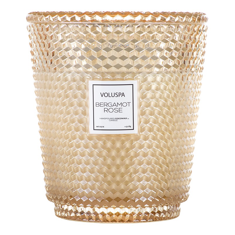 Bougie au sublime contenant en verre texturé en facette, les bougies Voluspa sont un mélange de cire végétale à la noix de coco, avec une mèche 100% coton.