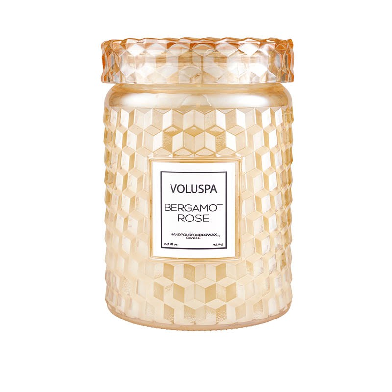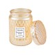 Bougie au sublime contenant en verre texturé en facette, les bougies Voluspa sont un mélange de cire végétale à la noix de coco, avec une mèche 100% coton.