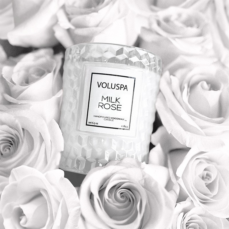 Bougie au sublime contenant en verre texturé en facette, les bougies Voluspa sont un mélange de cire végétale à la noix de coco, avec une mèche 100% coton.