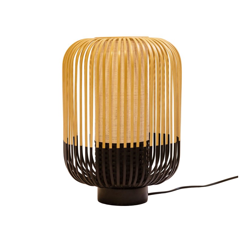 Son abat-jour bicolore, tout comme son diffuseur, sont composés de lamelles de bambous naturels, et d’un socle en bois.