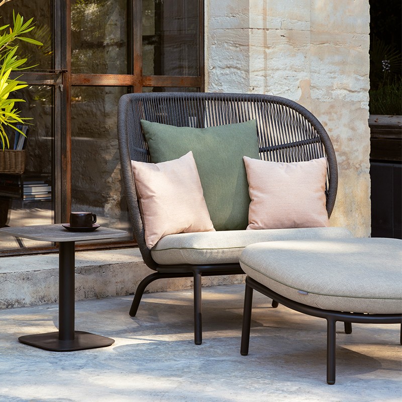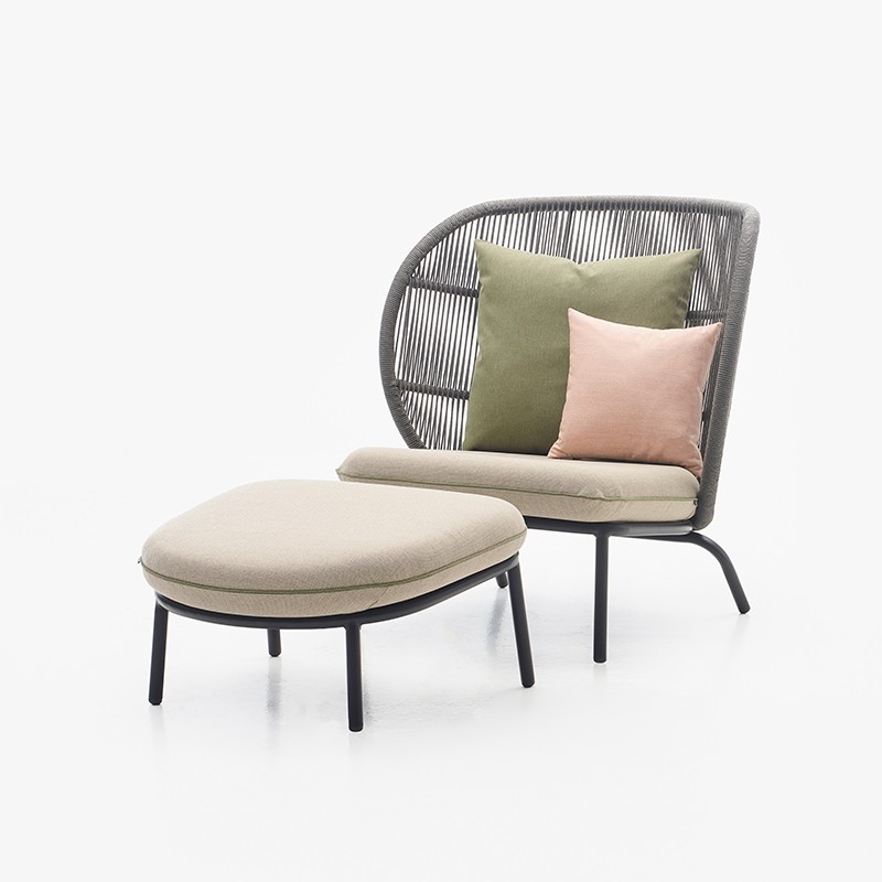 Offrez vous un détente grâce au repose pied kodo. Le tissage tactile et les coussins confortables amènent votre expérience d'assise à un niveau rarement égalé. Design : Studio Segers. Corde en fibre acrylique. Cadre en aluminium themolaqué.