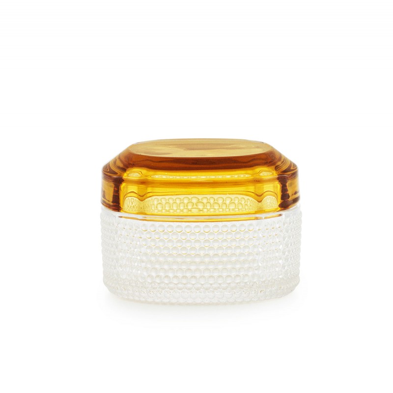 La partie inférieure transparente ornée de motifs et le couvercle qui se décline dans de nombreux coloris sont en verre épais. Inspirées par celles de boites anciennes, ses formes sont douces et arrondies.