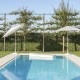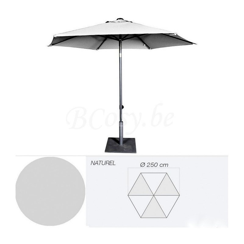Parasol 3 mètres de diamètre. Toile ton naturel, mât blanc, socle, housse de protection incluse.