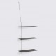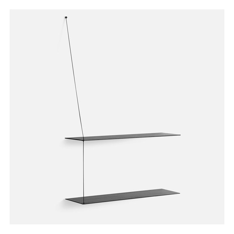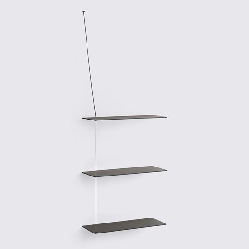 Très minimaliste, elle est une jolie illusion d'optique tout en déséquilibre avec son unique et fine structure latérale. Néanmoins cette solide étagère, aux tablettes noires, semble avoir été réduite au minimum.