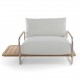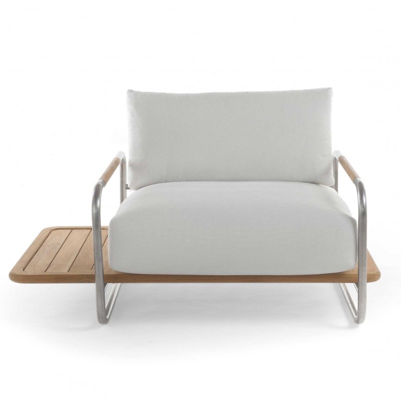 Ce n'est pas parce qu'il n'est que le petit frère du canapé, que le fauteuil Hugo n'a pas toutes les qualités de son ainé. Le designer Jamie Durie a utilisé pour la marque italienne Unopiù les mêmes matériaux. Les accoudoirs sont en acier inoxydable et présentent le même design étonnant que ceux du 2 places, dénotant la même impression d'apesanteur. Du teck et un tissu 100% acrylique viennent compléter le meuble. Son design d'inspiration fifties revu et corrigé en fait un fauteuil terriblement contemporain. Sa petite différence qui fait toute sa personnalité, la tablette est ici unilatérale.