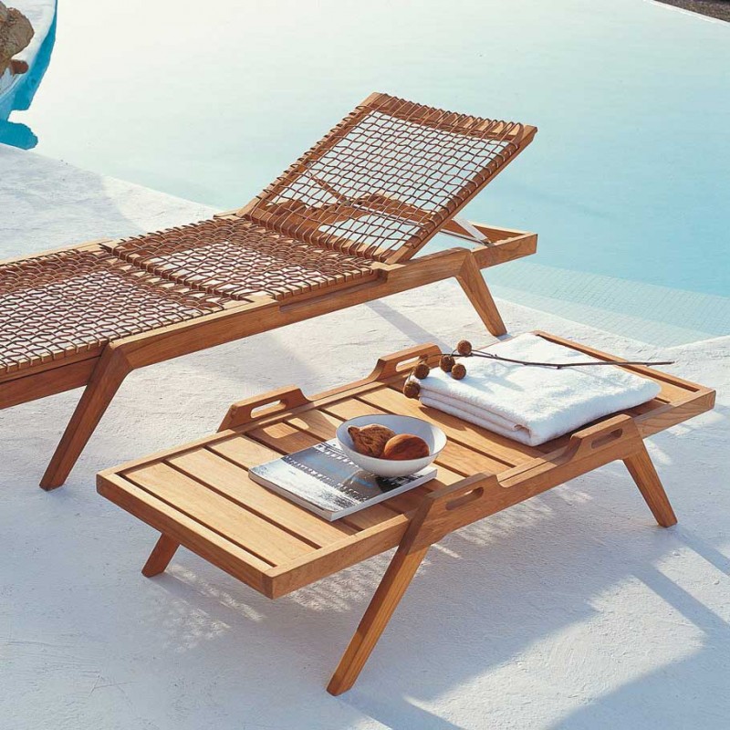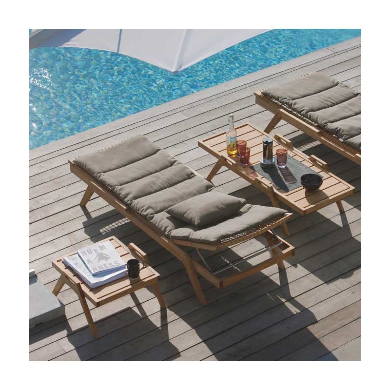 Travaillée artisanalement, sa structure en teck reprend un modèle de lattes.