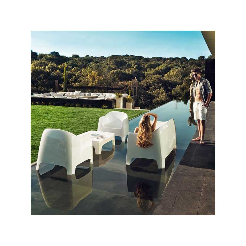 La marque espagnole Vondom a demandé aux designers Stefano Giovannoni et Elisa Gargan d'imaginer pour elle l'ensemble de salon Solid. Conçu spécialement pour l'extérieur, il est composé d'un canapé, de fauteuils et d'une table basse.