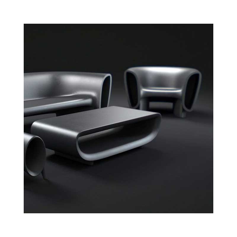 En créant la collection et la table basse Bum Bum pour la griffe hispanique Vondom, Eugeni Quitllet est parti du postulat : ne pas faire des meubles mais des instruments de musique seventies qui auraient croisé la route de ceux du XXIe siècle. Comme un unique bloc de résine de polyéthylène moulé, le designer a imaginé une ouverture en son centre pour laisser passer la lumière et alléger l'ensemble de sa silhouette ainsi que son poids. La table Bum Bum oscille entre revival 70 et ultra contemporain. Un réalisateur comme Stanley Kubrick n'aurait en rien renié la Bum Bum pour le décor de son iconique Korova Milkbar.