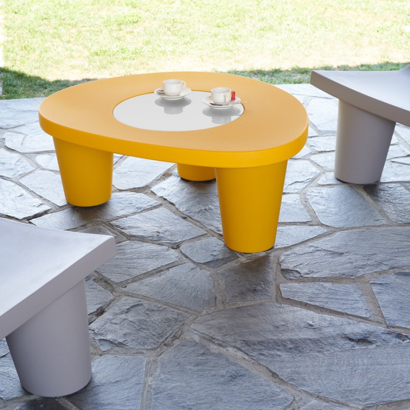 Paola Navone a rajouté à la table Low Lita une petite touche sophistiquée et très contemporaine : un cercle de verre trempé vient orner le centre du plateau.