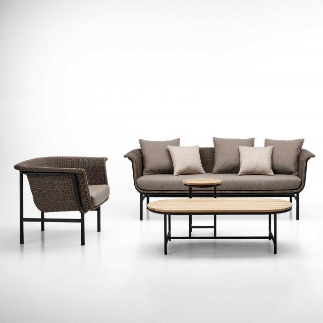 Comme pour le canapé et le fauteuil de la collection, la structure est en aluminium thermolaqué pour assurer force et pérennité.