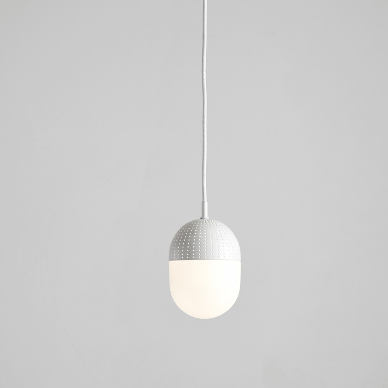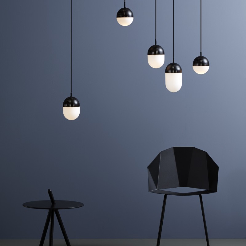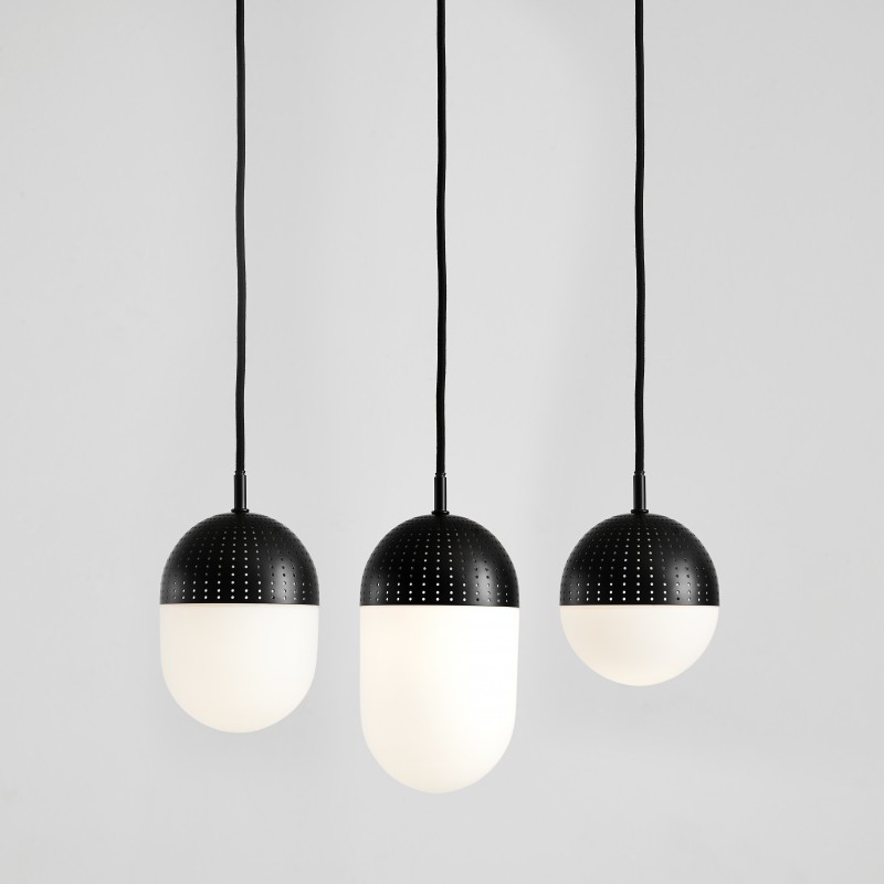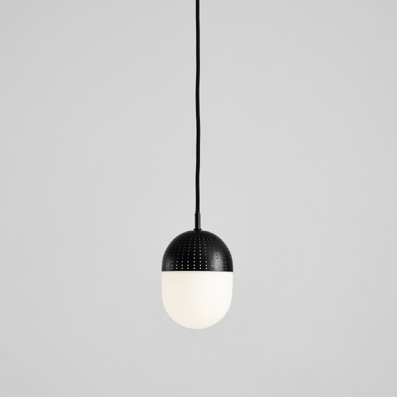 Ce luminaire de la marque danoise Woud propose deux matières et deux effets lumineux. La partie supérieure a un aspect brut, avec un métal laqué perforé régulièrement. La partie inférieure reflète la douceur, tout en verre opalin.