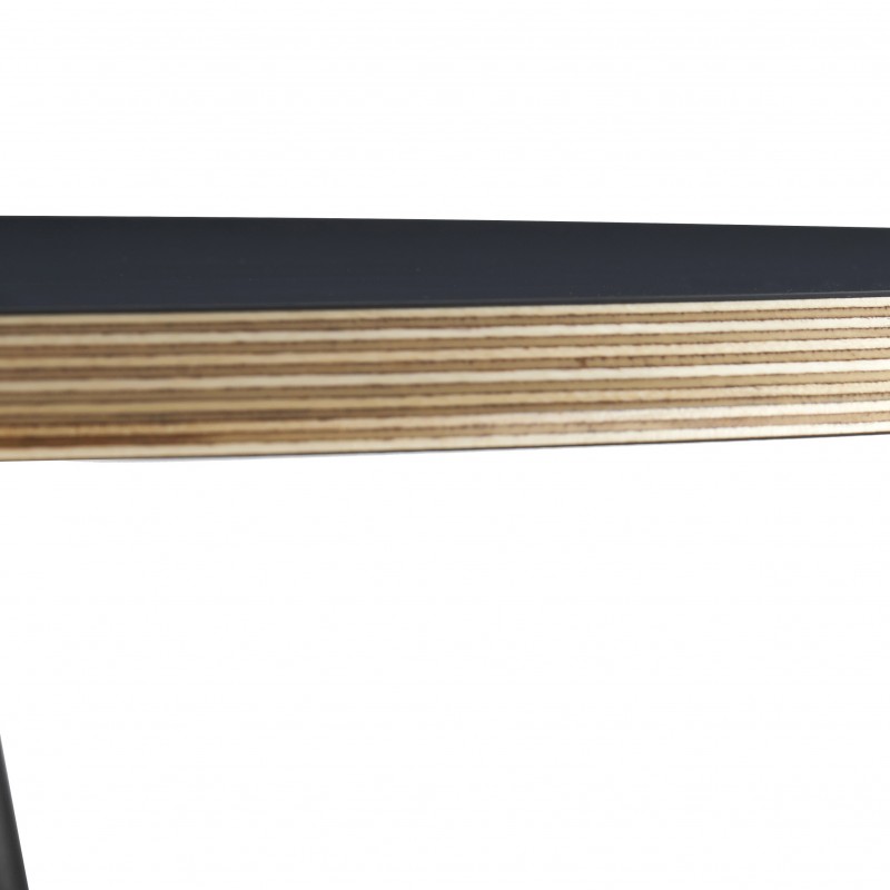 Le piètement est uniquement composé de trois pieds métalliques noirs. L'élégance froide de la partie inférieure est adoucie par la rondeur d'un plateau lisse et mat en contreplaqué fenix.