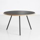Le piètement est uniquement composé de trois pieds métalliques noirs. L'élégance froide de la partie inférieure est adoucie par la rondeur d'un plateau lisse et mat en contreplaqué fenix.