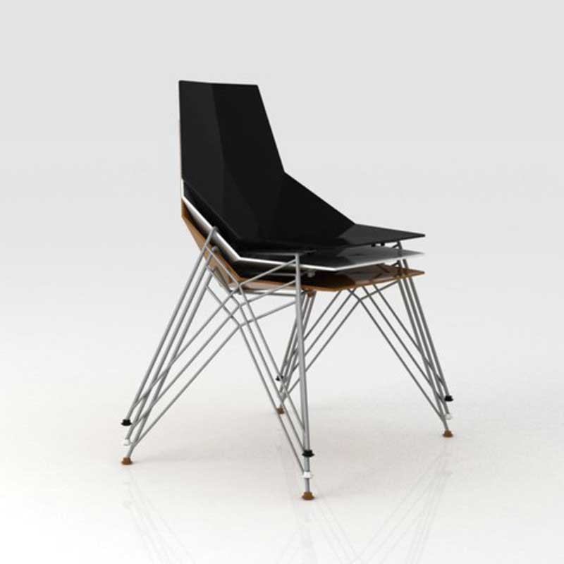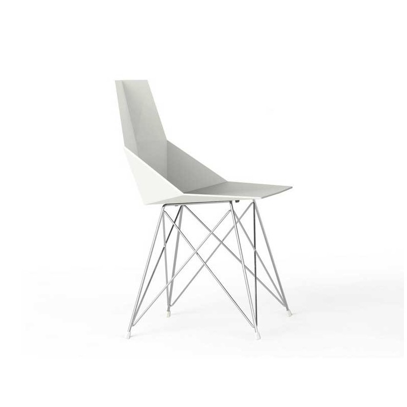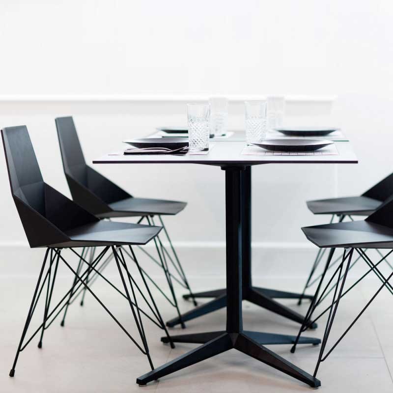 La chaise Faz distribuée par la marque espagnole Vondom et créée par Ramon Esteve existe en deux versions : avec un piètement en acier inoxydable ou en plexiglas. Alors que celui en métal semble se démultiplier à l'infini pour un rendu géométrique et complexe, le second joue sur la transparence pour mettre en valeur la partie supérieure.