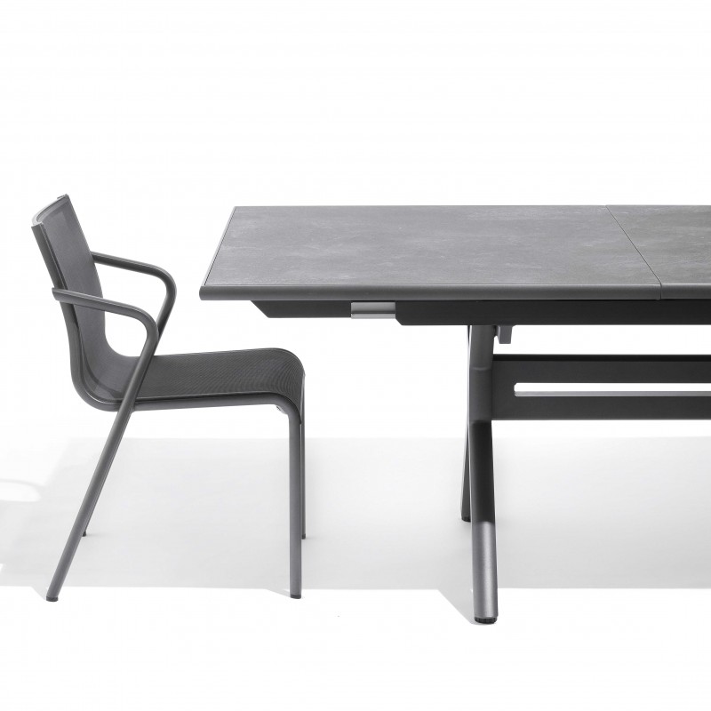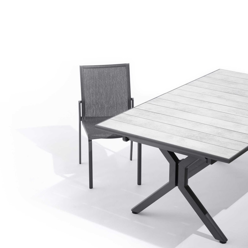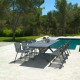 - Matériau : Structure en aluminium gris espace. Plateau en HPL haute résistance aux intempéries ardoise.