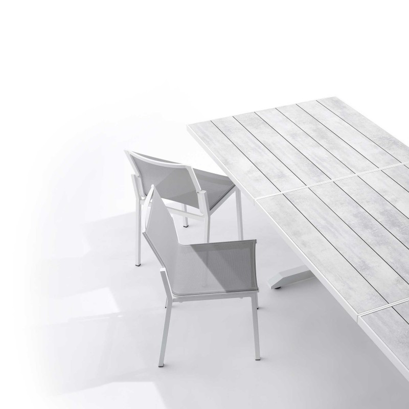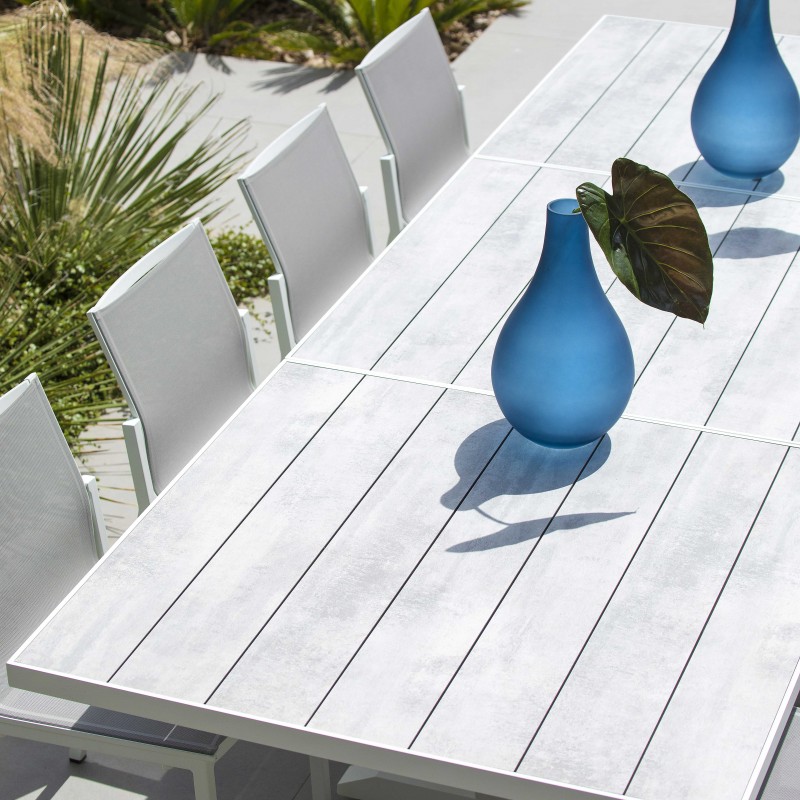 Le piètement est composé d'obliques en aluminium qui assurent une longévité pérenne au mobilier. En HPL et hautement technologique, le plateau aux finitions béton ciré résiste de moins 20 degrés à une température supérieure à 150 degrés Celsius.