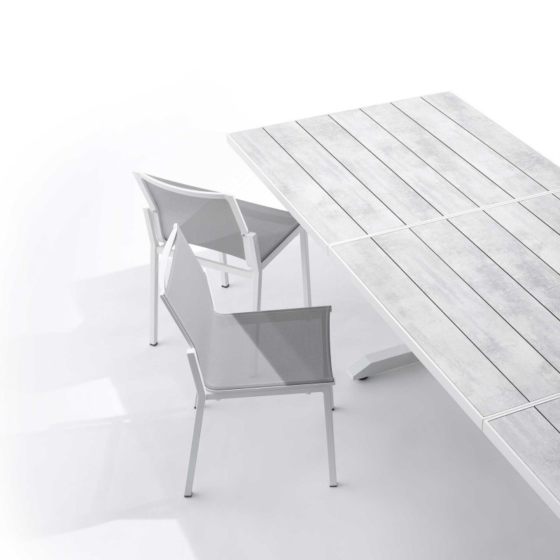 Le piètement est composé d'obliques en aluminium qui assurent une longévité pérenne au mobilier. En HPL et hautement technologique, le plateau aux finitions béton ciré résiste de moins 20 degrés à une température supérieure à 150 degrés Celsius.