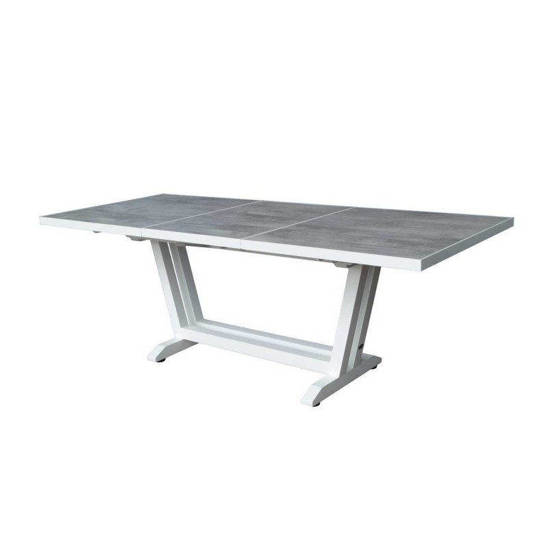 - Matériau : Structure en aluminium blanc et plateau latté en HPL finition béton ciré, système de rallonge par levier, pied central.