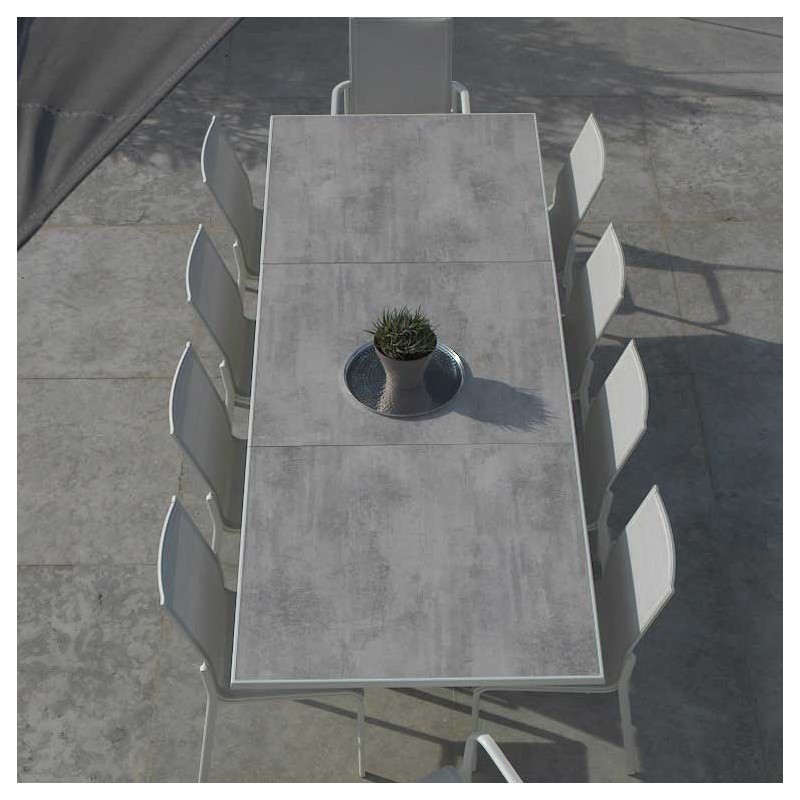 - Matériau : Chassis en aluminium blanc. Plateau en céramique béton ciré