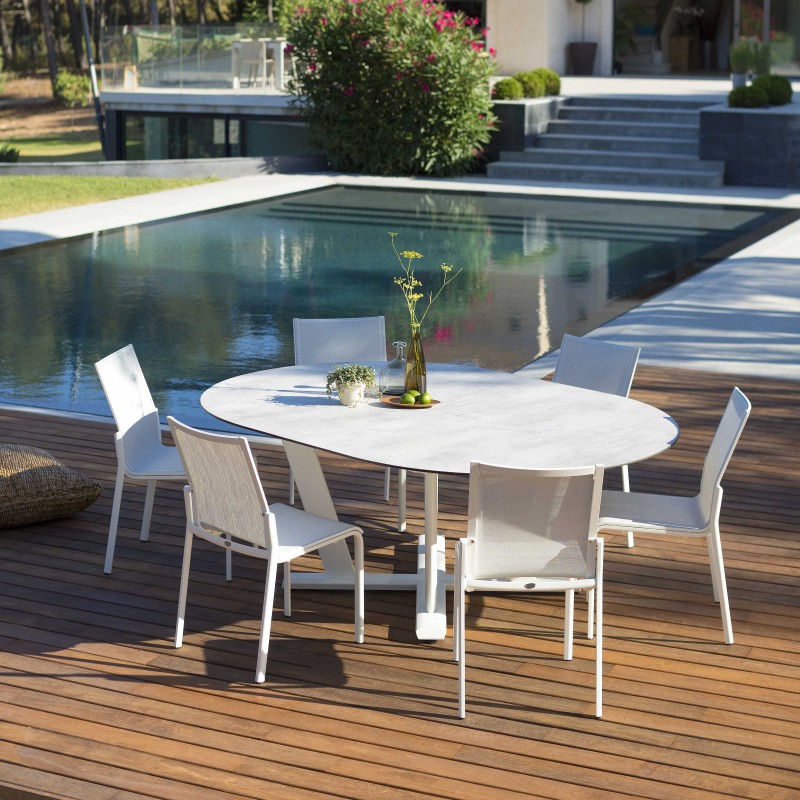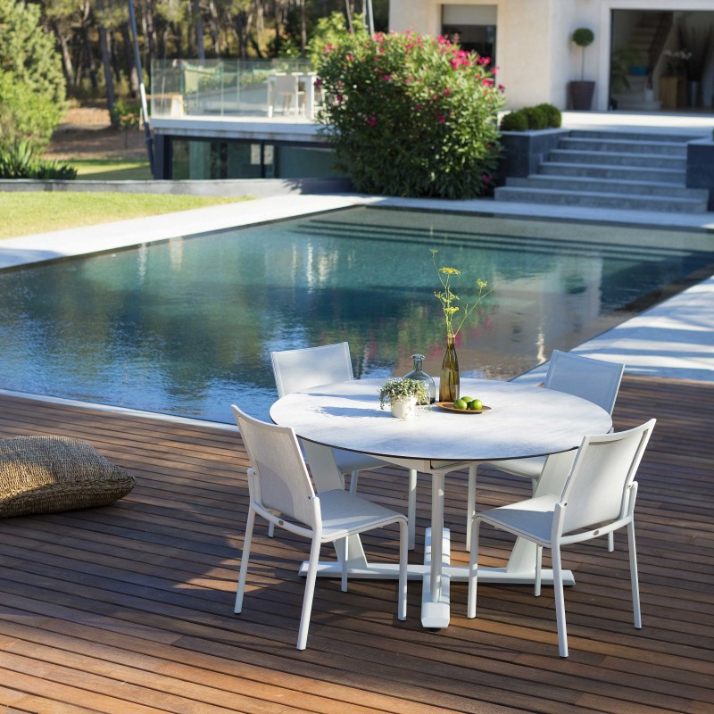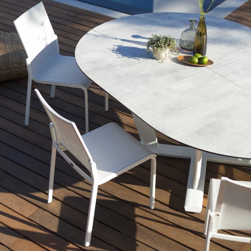 L'aluminium utilisé pour la structure de la chaise Koton en fait un objet léger, se déplaçant à votre guise et résistant quelle que soit la météo. Résistance que l'on retrouve dans la toile Batyline Eden qui compose son assise et son dossier.