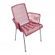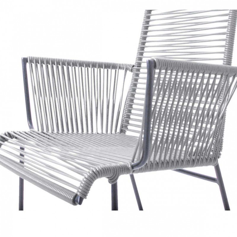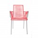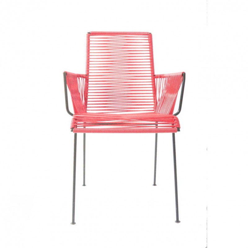 Véritable jeu de lignes à suivre à l'infini, elle s'amuse des verticales de sa structure en acier époxy qui contrastent avec les horizontales du tressage de son assise et de son dossier. Mais cette joueuse n'a pas hésité à brouiller les pistes en ajoutant les obliques des appui-bras.
