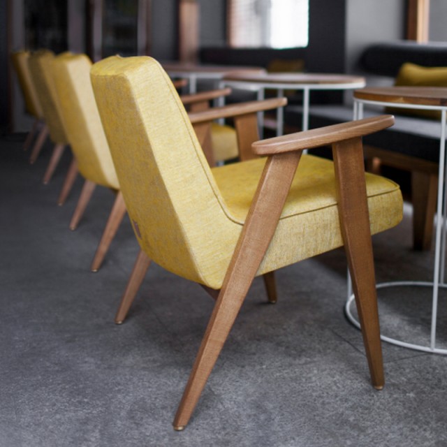 Un fauteuil au design intemporel, qui traverse les âges. Son esprit années 60 s'insère dans n'importe quel style d'intérieur. Le modèle présenté est en tissu chenille (groupe 3) et pieds chêne.
