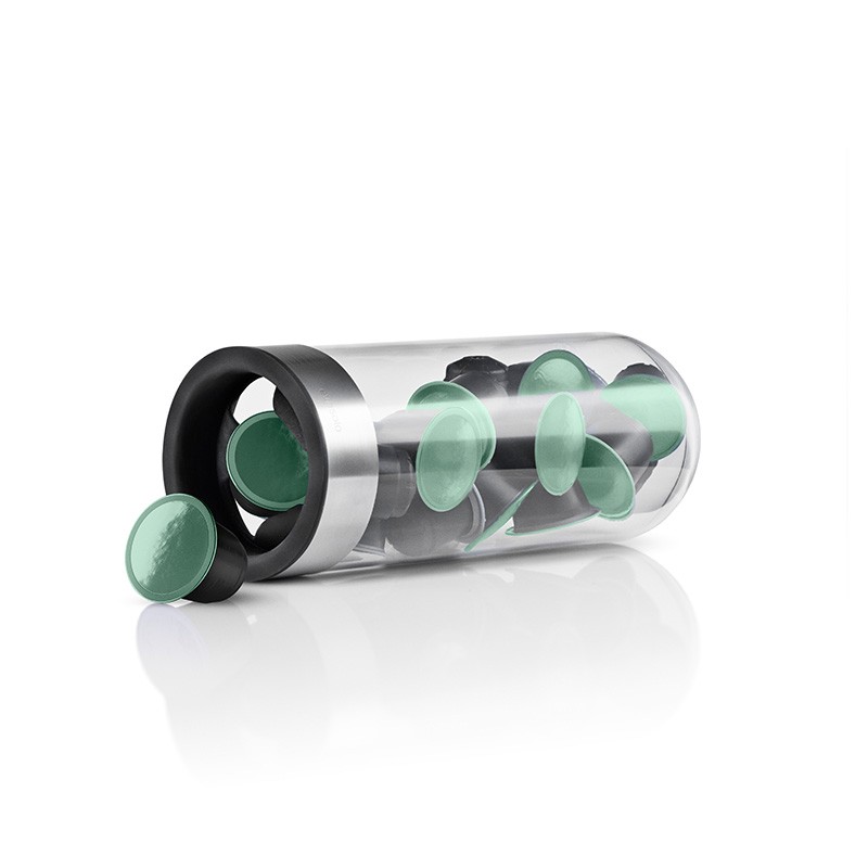 Le distributeur, ou comment ranger vos capsules à café avec design ! Le récipient en verre permet de voir la contenance, et son rabat en silicone vous permettra de sortir vos capsules au quotidien.